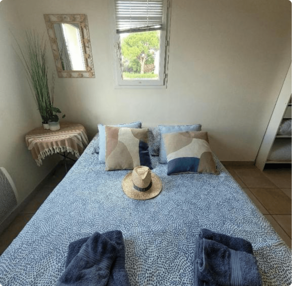 - 3 chambres à l’étage avec lit double (140 cm) et salle de bain attenante.