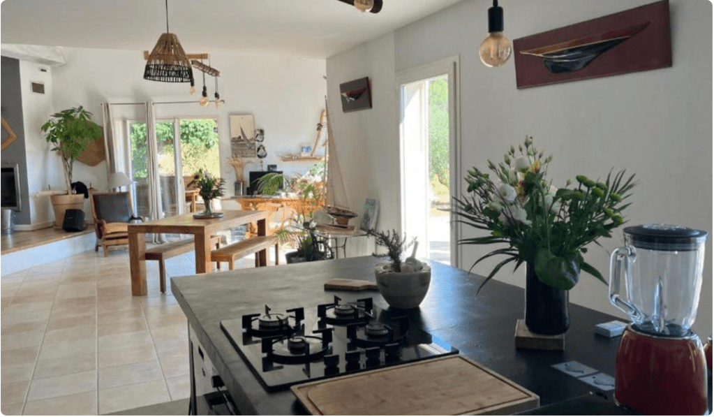 Plus de 80 m² ouverts sur les terrasses et la piscine grâce à 4 grandes baies vitrées.